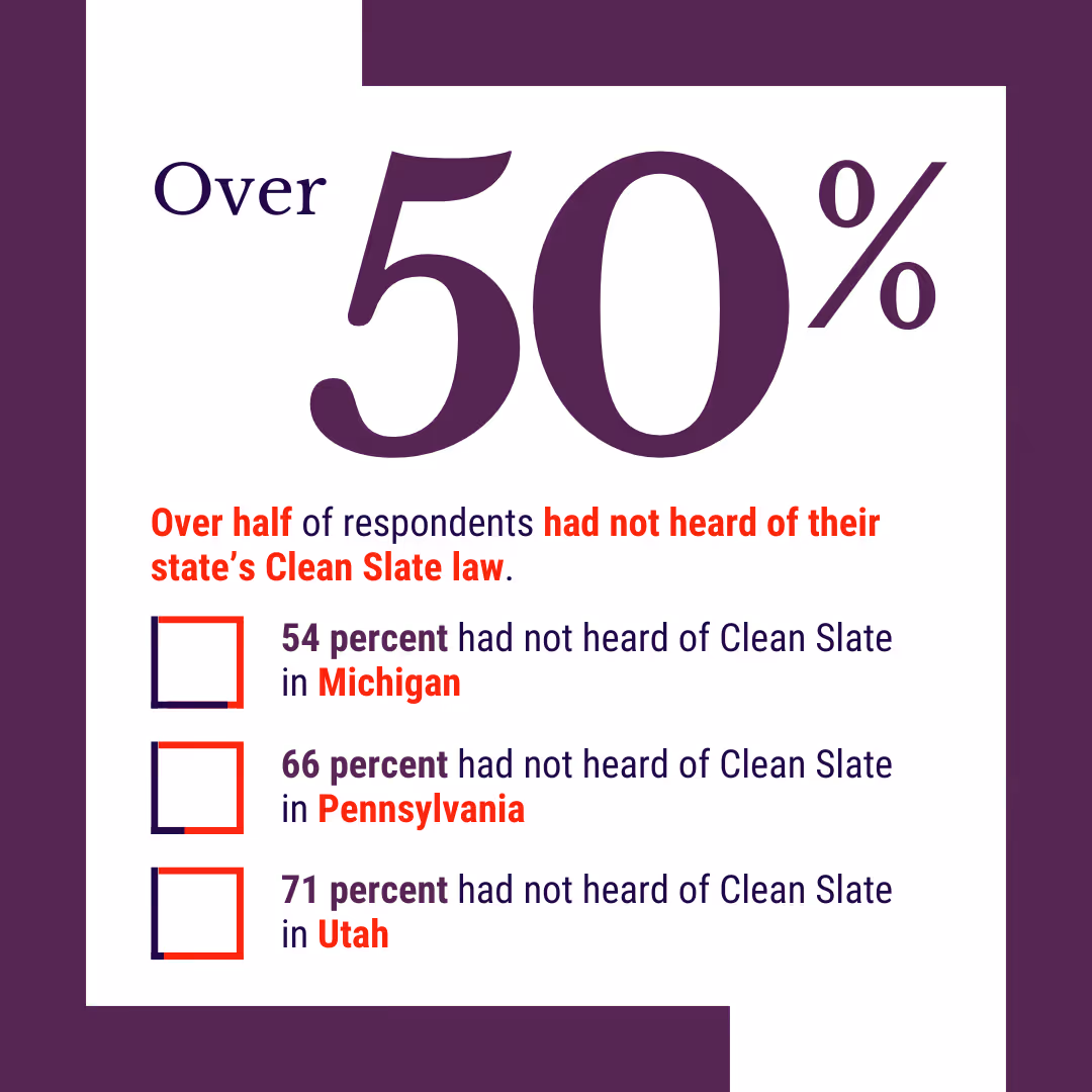 Many could benefit from Clean Slate — but don’t know it. Across the three states, nearly 50% of respondents believed they might be eligible for Clean Slate relief — but only 24% had heard of the law before the survey.