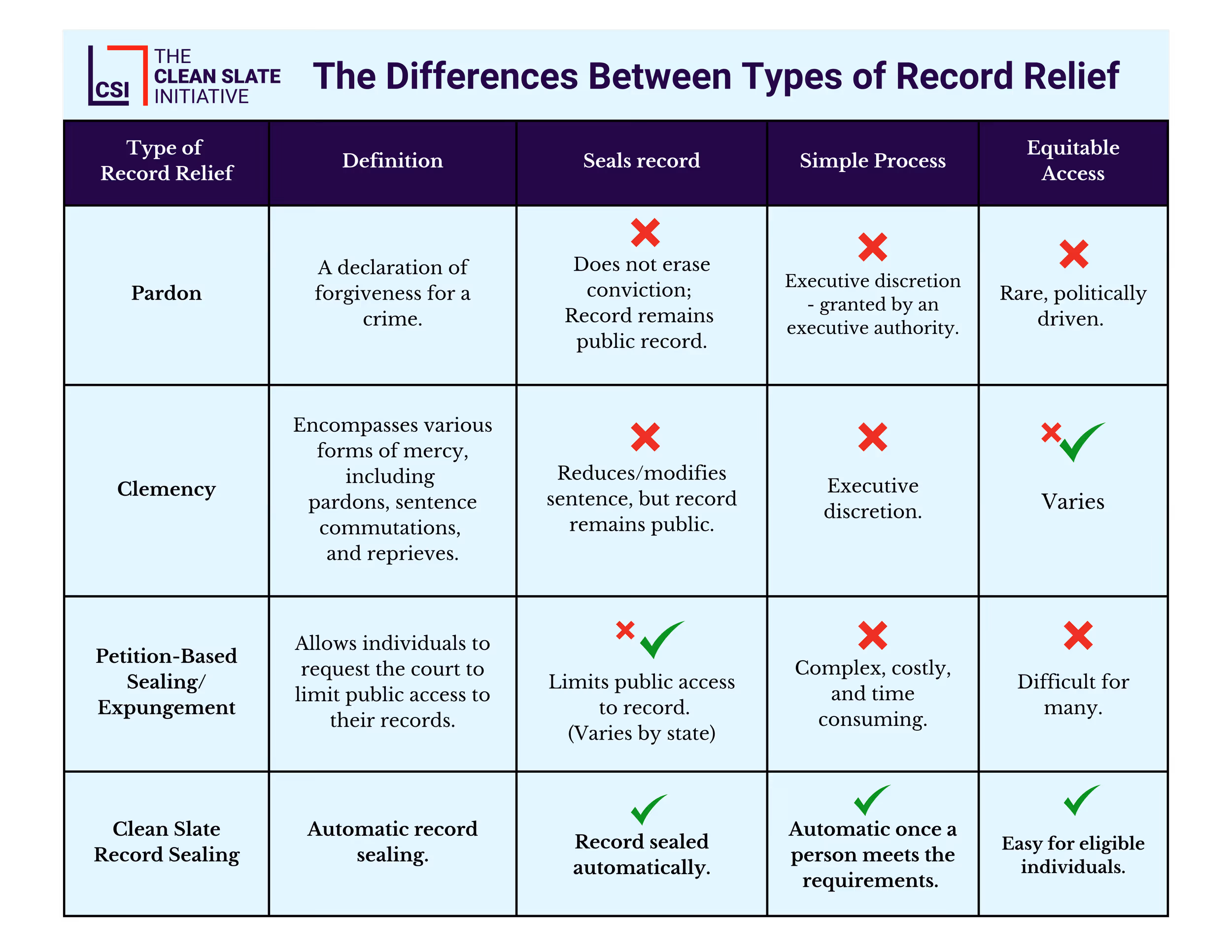 Record relief is making headlines across the country as discussions around second chances take center stage. With terms like pardon, clemency, expungement, and Clean Slate frequently appearing in the media, it’s more important than ever to understand the key differences between them. Let’s break down the various types of record relief and why the nuances matter — especially as lawmakers consider crucial reforms like Clean Slate policies at the state and federal levels.